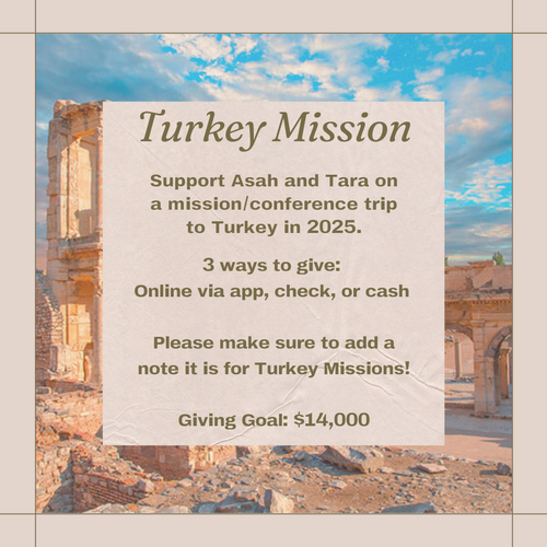 If you would like to support Asah and Tara for a Turkey Mission/Conference Trip please consider giving through our app, check, or cash.