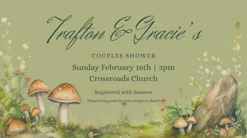 Join us for a celebration of Trafton and Gracie's upcoming wedding! We will have a couple's shower for them held at the church on Sunday, February 16th at 3pm! Please sign up using the link below.